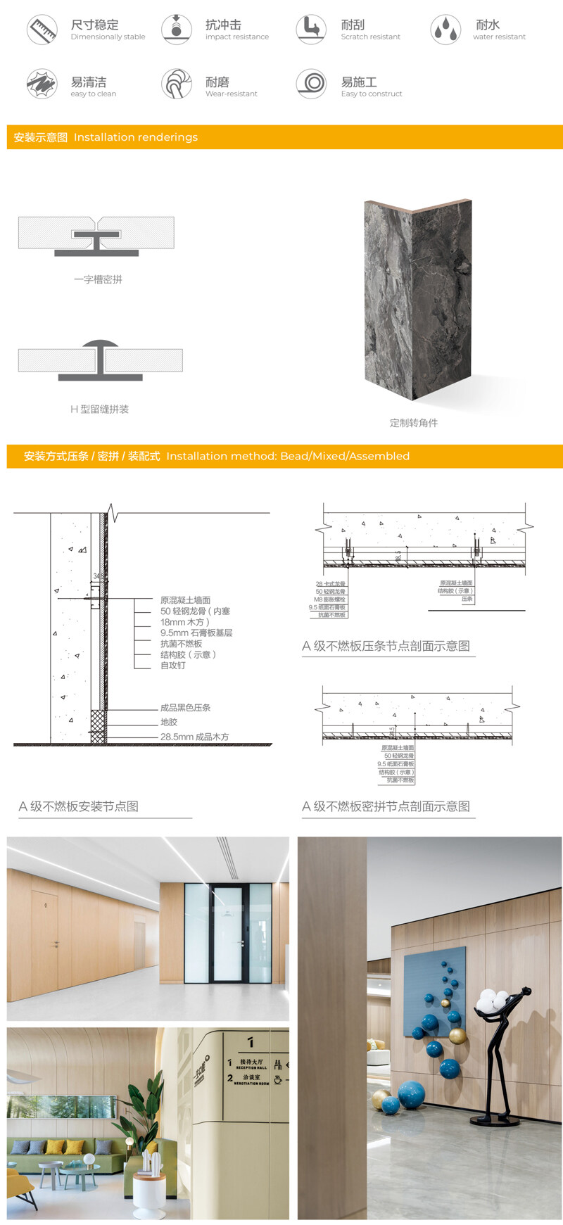 A级防火:选用不燃性材料为基材,并通过相关部门检测,达到A级防火不燃标准绿色环保:表面PVC、PET、PP膜热熔包覆处理,无有害气体释放,无辐射,无甲醛